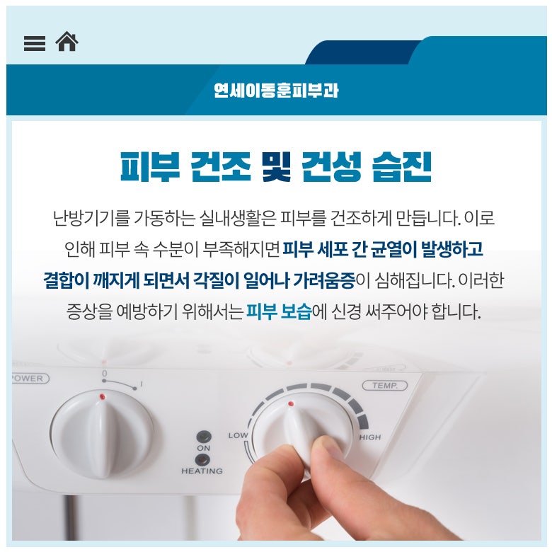 겨울에 더 가려움을 느끼는 이유를 보면 실내 온도를 높이면 건조하고 습도가 부족해서 습도에 주의를 기울여야 합니다.둘째, 수분 부족 때문에 피부가 건조하기 때문이다.셋째, 양털 옷이나 짜식 청바지를 입고 레깅스도 책임진다.넷째, 빠른 온도 변경 때문에 겨울보다 피부질환에 노출될 수 있기 때문에 겨울보다 더 조심해야 합니다.