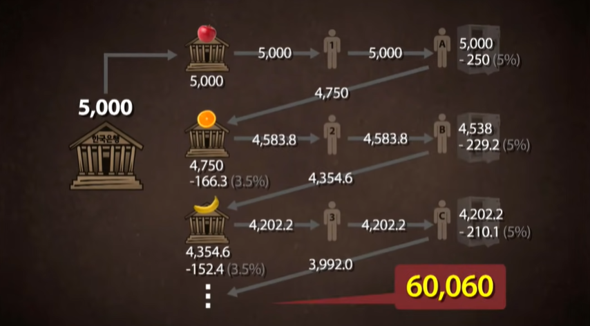 지급준비율이 3.5%일 때 5000억원이 얼마나 많은 돈을 벌 수 있는지 알아보자. 한국은행에서 5000억원을 빌린 애플뱅크는 1호에게 5000원을 빌려주어 오렌지뱅크 안전금고에 마이너스 5%를 입금했다. Orange Bank는 사람 2에게 지급준비율 3.5%를 뺀 금액을 빌려줍니다. 이렇게 끝까지 돈을 벌면 60조600억원이 된다.